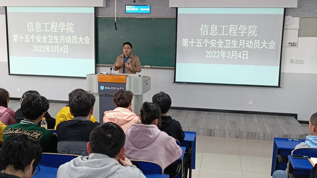 为切实加强学生养成教育,提升安全意识,加强疫情防控期间的卫生管理,形成良好的宿风、学风,积极响应学校第十五个安全卫生月主题教育活动。信息工程学院于3月4日中午在6202教室召开了“第十五个安全卫生月动员大会”。大会由学院团总支书记梅云凤主持,党总支副书记张伟伟出席了会议,全体2020级、2021级各班级班长和寝室长参加了动员大会。