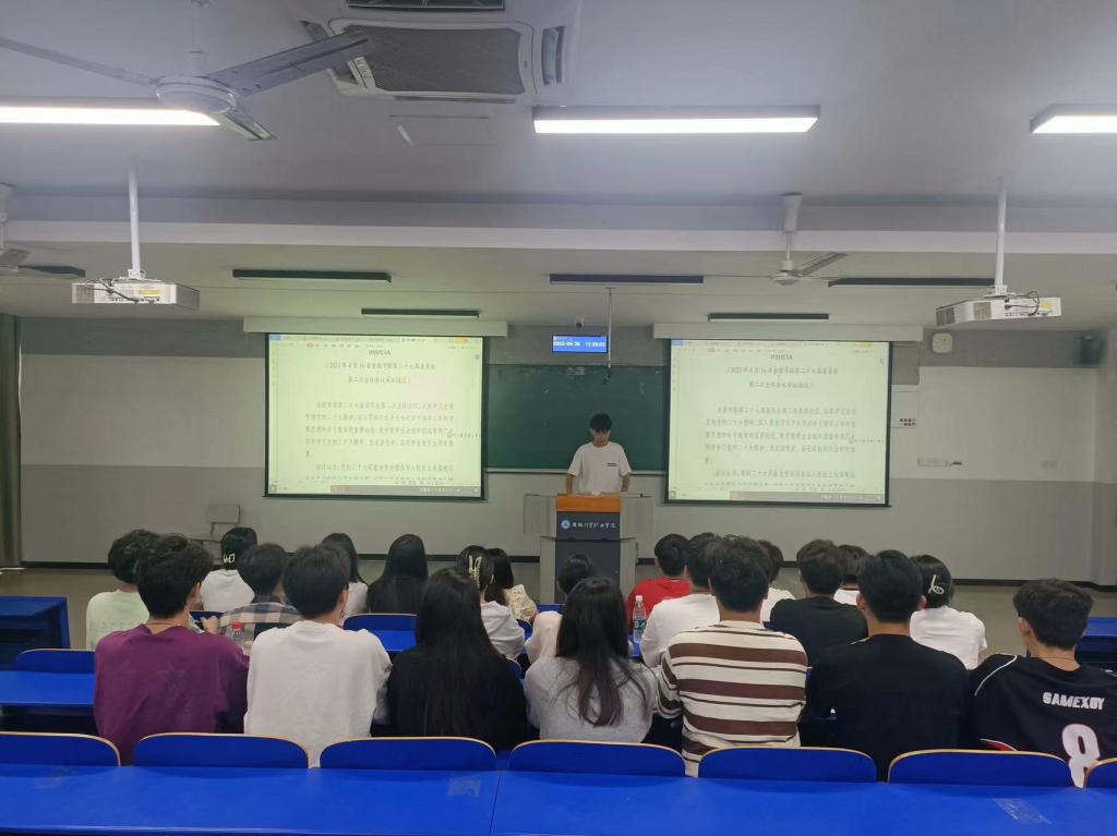 会上,尹礼毅同学宣读并讲解《关于认真学习宣传贯彻党的二十大精神团结带领广大同学坚定跟党走、奋进新征程的决议》等学习资料,高举习近平新时代中国特色社会主义思想伟大旗帜,认真学习宣传贯彻党的二十大精神,深入贯彻习近平总书记关于青年工作的重要思想和关于教育的重要论述,坚持党的领导,把握时代主题,牢记服务宗旨,勇于自我革命,团结带领广大同学在全面建设社会主义现代化国家的道路上永远跟党走、奋进新征程。