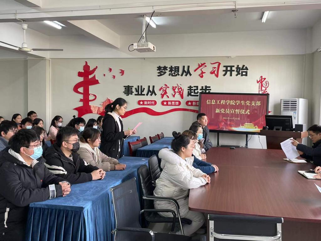 12月31日中午,信息工程学院学生党支部在313办公室召开新党员宣誓大会,大会由学生党支部组织委员姚德健老师主持,信息工程学院党总支书记邓庆安和学生党支部所有师生党员参会。