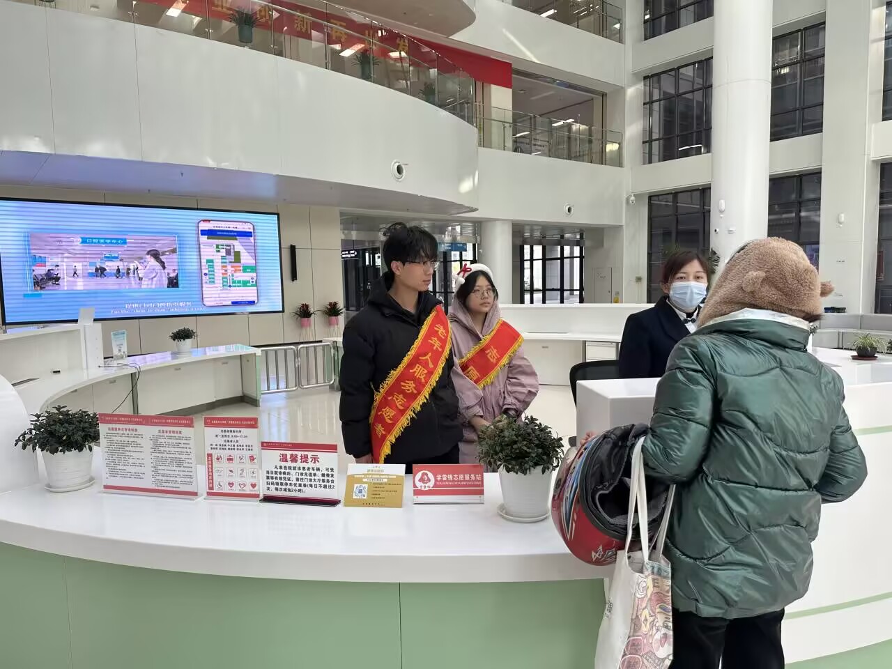 活动中,志愿者们位于各个门诊大厅,主动为前来的患者提供医疗咨询与引导,认真解答患者的问题,志愿者们于自助机前耐心地引导患者,力保每位患者都能够迅速,精准地完成门诊报道,为患者提供细致入微的帮助。