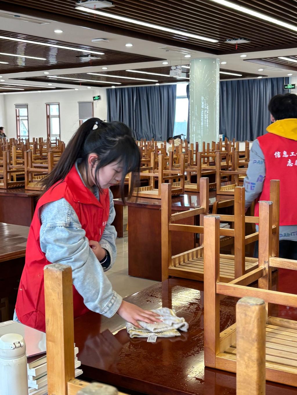 本次志愿服务活动共招募四十位志愿者,志愿者们分工明确,配合默契。有的负责擦拭书架表面,有的则负责清理书架内部的灰尘和杂物。他们手持抹布、刷子等清洁工具,一丝不苟地擦拭着每一个书架,不放过任何一个角落。