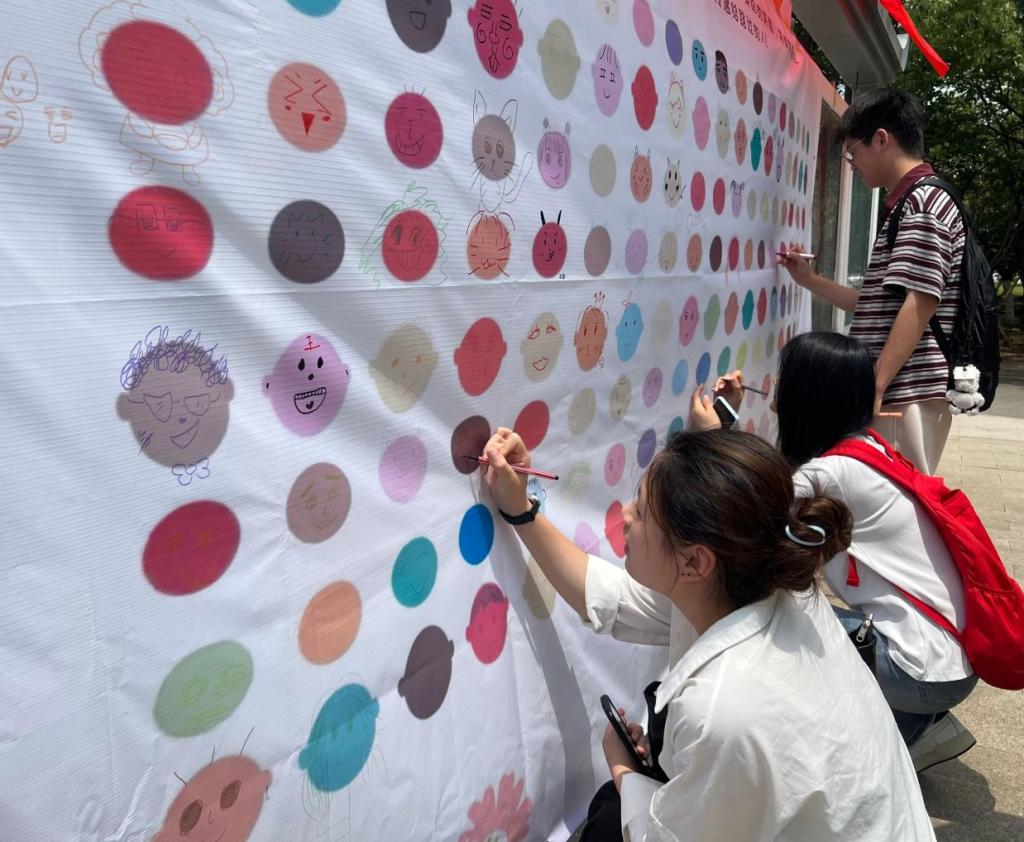 活动现场设置了“色彩涂鸦”和“笑脸收集墙”。同学们用画纸与画笔自由创作,将内心的情感转化为绚丽的色彩;在笑脸收集墙前,大家通过拍摄或手绘笑脸,记录下生活中的美好瞬间。