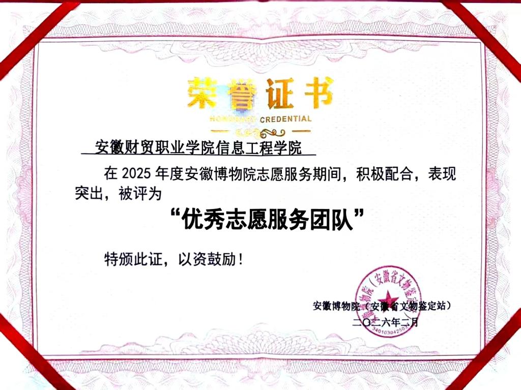 会上,学院“红芯引擎”志愿者服务队凭借过去一年中的出色表现,荣获了安徽博物院颁发的“优秀志愿服务团队”奖项,这一荣誉不仅是对“红芯引擎”志愿者们辛勤付出的高度赞誉,也标志着学院在社会服务领域取得的又一里程碑式的成就。