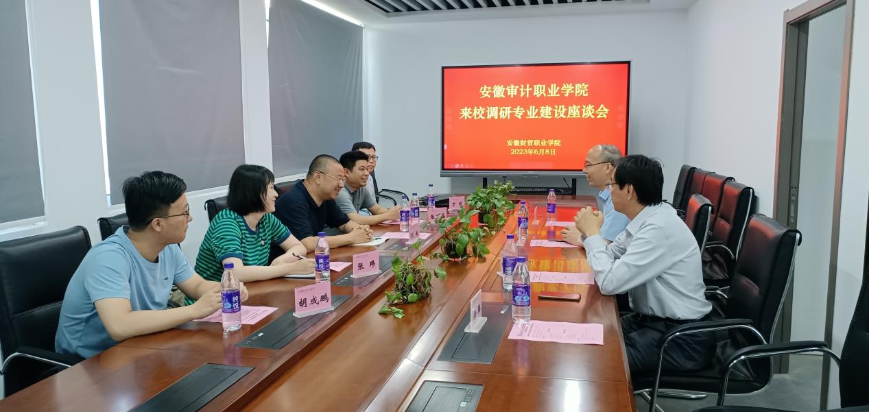 6月8日下午,安徽审计职业学院综合教育学院副院长刘放和现代教育技术中心副主任张丁鑫一行来我校信息工程学院调研专业建设工作,学校信息工程学院院长张成叔和副院长姚成接待来访,并在第二实训大楼A801工作室召开座谈交流会。