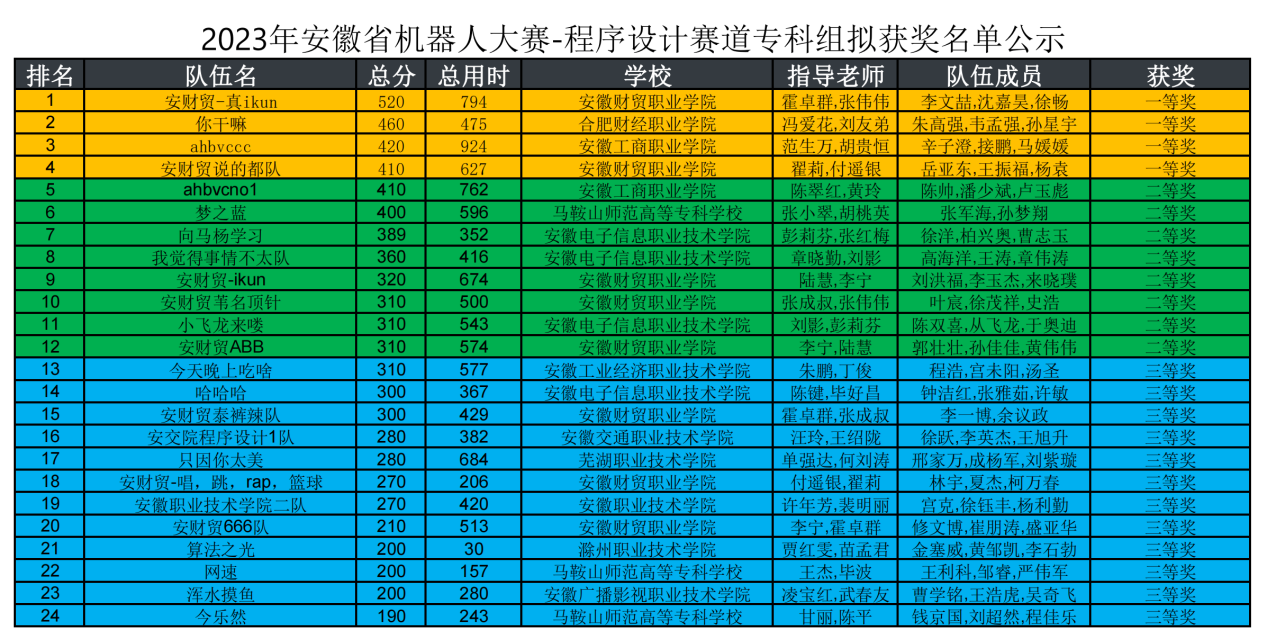 5月20-21日,由安徽省教育厅主办,beat365中文官方网站、合肥工业大学、合肥学院等共同承办的2023年安徽省大学生程序设计大赛(安徽省机器人大赛—程序设计赛项)顺利结束,beat365中文官方网站派出的代表队获得高职组第1名的优异成绩,学院已连续十二年蝉联冠军。