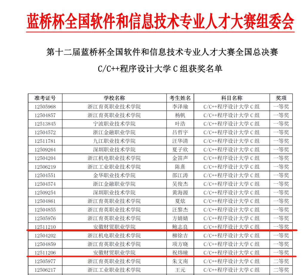 6月8日,第十二届“蓝桥杯”全国软件和信息技术专业人才大赛(以下简称“蓝桥杯”全国大赛)全国总决赛结果揭晓。我校信息工程学院鲍志良和祝伟曈两位同学均获得一等奖的优异成绩,再创辉煌!