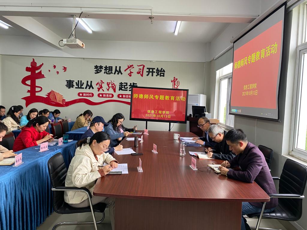 为进一步强化学院师德师风建设,提高全体教职工职业道德素养,落实立德树人根本任务,10月13日下午,信息工程学院组织开展第四次师德师风学习教育,学院全体教职工参加学习会,会议由信息工程学院党总支书记邓庆安主持。