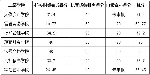 根据《关于举办beat365中文官方网站第五届“互联网+”大学生创新创业大赛的通知》(院招字〔2019〕76号)之附件6《优秀组织奖和组织奖评审规则》相关规定,大赛组委会办公室分别根据任务指标完成情况、比赛成绩排名情况、申报资料上报情况三个方面对各二级学院的赛事组织工作进行了评审。现将各二级学院参评得分和评审结果予以公示。