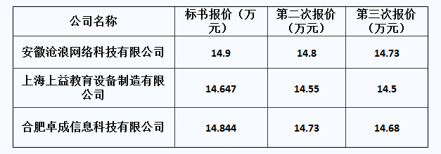 beat365中文官方网站“汽车营销与服务”专业实训设备采购竞争性谈判小组于2016年11月21日14:00在学院行政楼二楼小会议室进行了谈判。报名单位有四家,分别是安徽沧浪网络科技有限公司、上海上益教育设备制造有限公司、合肥卓成信息科技有限公司、河南协成科教设备有限公司。根据谈判公告递交响应文件的有三家,分别是安徽沧浪网络科技有限公司、上海上益教育设备制造有限公司、合肥卓成信息科技有限公司。三家公司报价如下: