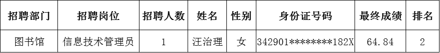 在2021年度学院公开招聘聘用制人员体检考察阶段,因图书馆信息技术管理员岗(201230)第一名考生放弃,该岗位空缺1人。根据《beat365中文官方网站2021年度公开招聘聘用制人员公告》,依据考生最终成绩从高分到低分排名结果,按照1:1比例等额递补第二名考生进入资格复审,现予以公布。资格复审合格后,将进入体检及考察政审阶段。