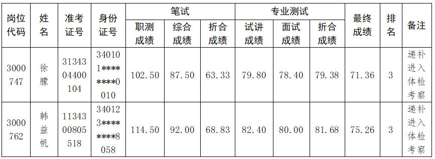 在学院2024年度省直事业单位公开招聘工作人员体检考察阶段,因考生放弃体检政审等原因,3000747专业技术岗位和3000762管理岗位分别缺额1人,根据《关于印发2024年度安徽省直事业单位统一笔试公开招聘工作人员实施方案的通知》《beat365中文官方网站2024年度省直事业单位公开招聘工作人员专业测试及有关工作实施方案》要求,按照考生最终成绩从高分到低分排名结果,按照1:1比例等额递补进入体检考察人员,递补考生信息如下。