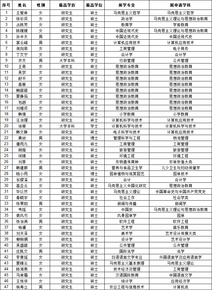 根据《安徽省教育厅关于做好2023年高等学校教师资格认定工作的通知》(皖教秘人〔2023〕58号)、《关于做好2023年高等学校教师资格认定工作的通知》(组发〔2023〕6号)等文件精神,经网上报名、现场确认、教育教学基本素质和能力测试等工作程序,现将2023年学院教师资格认定初审合格人员予以公示,具体名单如下:
