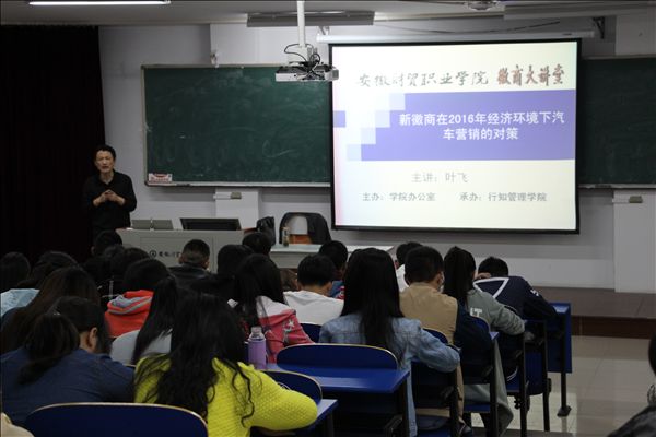 4月27日晚,首期徽商大讲堂继续精彩分享。主讲人叶飞为雪岩贸易学院副教授,以“新徽商在2016年经济环境下汽车营销的对策”为题,结合国家2016年的经济政策,分享了在新的经济形势下如何做好汽车营销工作。