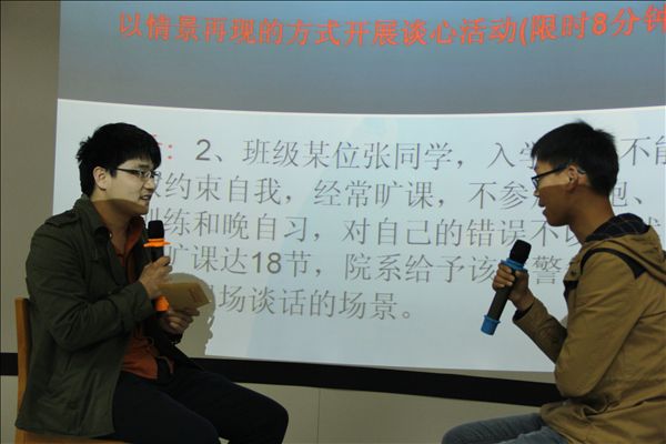 比赛主要考察面对学生管理过程中常见思想认识问题、心理问题、行为问题等,辅导员的处理协调和沟通教育能力。学生处精心设计了考题,选手抽题作答,模拟谈话。比赛中,各选手都能结合考题,细致分析、全面权衡,针对学生迷恋网络、排斥思政教育、软对抗管理制度的行为,面对学生纠结于创业就业困惑,专升本的顾虑,迷失于社会不公平、社会腐败、学习无用论的认知偏狭现象以及常见的沟通障碍、人际交往、感情处理技巧等心理问题,选手们能从一定的高度,结合理论和事例,耐心细致的和学生谈心交流,晓之以理动之以情,引导学生正确地认知和处理。现场的沟通谈话,既展示了选手的经验与智慧,也体现了作为老师的爱心和责任感。