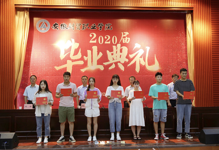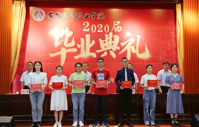 典礼现场,胡戴新宣读表彰文件,李妮等81名同学荣获“2020年安徽省普通高等学校品学兼优毕业生”称号,夏敏等269名同学荣获“2020年beat365中文官方网站优秀毕业生”称号,学院领导为获奖学生代表颁奖。
