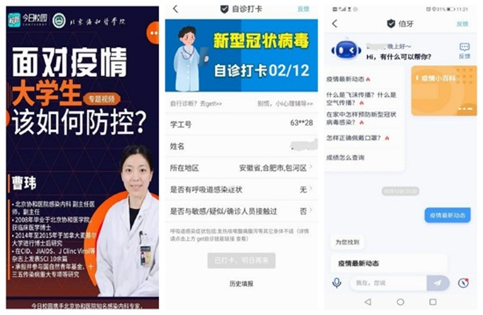 普及科学防护知识。自2月1日在今日校园--校园百事通,推出“疫情小百科”,为学生提供实时防疫互动百科问答,了解最新疫情动态,在线问诊、科学掌握新型冠状病毒感染的肺炎防护知识。自2月2日开通今日校园--疫情诊断,进行学生健康状态管理,学生可以每日登录自诊打卡、自行诊断、在线咨询医生,帮助学生面对疫情,保持积极乐观的情绪、健康向上的心态。组织学生在线上收看《面对疫情大学生该如何防控》、《新型冠状病毒感染的肺炎识别及自我防护》等直播,引导学生正确理性看待疫情,增强自我防范意识和防护能力。
