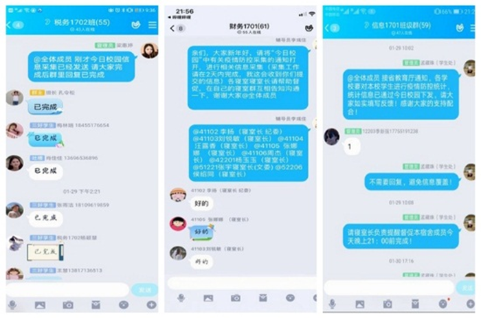 强化责任担当意识。在这场看不见硝烟的疫情防控战面前,疫情就是命令,防控就是责任。全体辅导员心系学生健康,以过硬的政治素养和责任担当意识,在实际行动中践行初心使命,加强学生思想引导、心理疏导、学习辅导、生活指导,坚定学生打赢抗击疫情的信心和决心。通过班级群QQ群、微信群、电话、短信等形式,及时发布疫情防控知识,引导学生做好科学防护,及时与学生本人及家长、学生干部保持联系,密切关注班级学生动态,实时统计学生假期行程安排,全面掌握学生健康状况,严格落实 “日报告、零报告”制度,关心、保护、陪伴学生平安健康地度过疫情。
