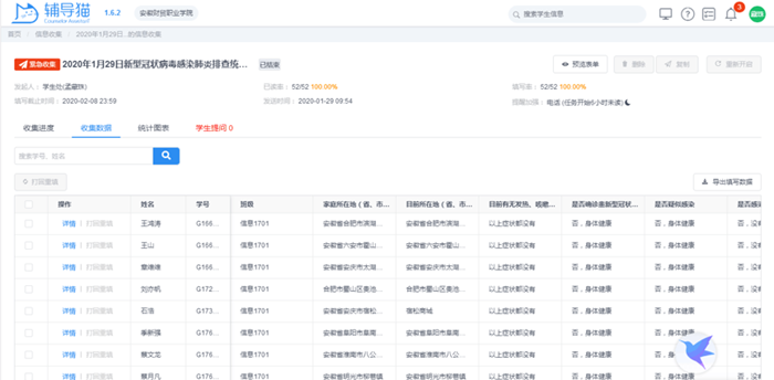 精准采集报送信息。充分发挥智慧校园建设平台作用,精准及时地做好疫情防控学生信息采集报送工作,1月29日利用今日校园-辅导员工作平台(辅导猫),组织全校学生在线填写信息,全面摸排了解每一名学生寒假期间出行情况、健康状况等,掌握全校16000余名学生疫情防控信息,做到全覆盖、无遗漏,重点摸清目前仍在湖北省以及从外省返回安徽的学生近况,建立“人盯人”的管理机制,切实做好疫情防控工作。