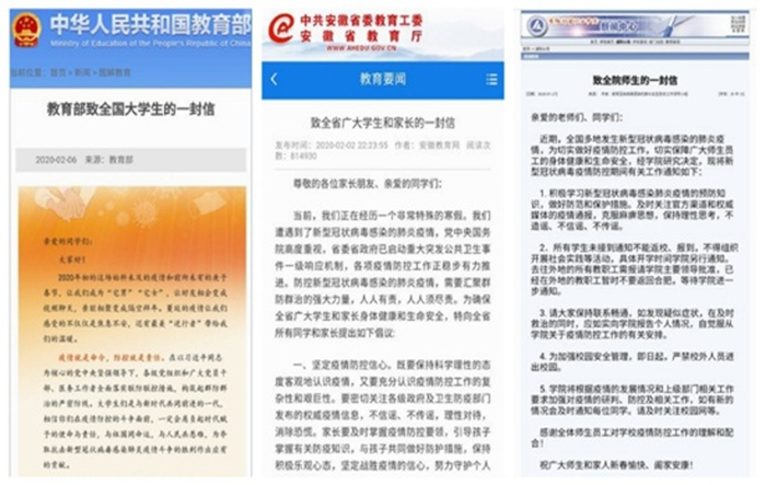 加强正面宣传引导。按照上级和学校防控工作领导小组的通知要求,通过校园网、安财学生管理QQ群、安财辅导员微信群、今日校园等形式,学生处、各院部及时转发《教育部致全国大学生的一封信》、《省教育厅致全省广大学生和家长的一封信》、《学校致全院师生的一封信》等,将《关于寒假期间学生不要提前返校的通知》发至各班级QQ群、微信群,通知每位学生延迟开学、所有学生不得提前返校,提醒学生要遵守当地政府疫情管控规定,做好疫情防护工作。引导学生关注国家卫生健康委、安徽省卫健委等官方平台公布的疫情信息,提高学生对疫情的认识,做到不造谣、不信谣、不传谣,用实际行动维护大局、服从大局,弘扬青春正能量。