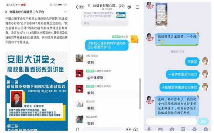 开通网络心理服务。根据国家卫生健康委1月26日印发的《新型冠状病毒感染的肺炎疫情紧急心理危机干预指导原则》,为积极应对新冠肺炎疫情,学校启动疫情防控期间心理干预系统,加强心理疏导、做好人文关怀,印发《关于疫情防控期间开通师生心理支持热线和网络辅导服务的通知》,自2月1日起至开学,心理健康教育中心面向全校师生开通心理支持热线和网络辅导服务,组建心理援助服务团队,每天有3名专业心理咨询师为全校师生提供及时专业的心理咨询服务。截至日前,心理援助服务团队接到近40名学生的咨询和求助,主要通过网络心理辅导、邮件心理辅导、心理支持热线等服务方式,进行温暖有爱的共情理解、耐心细致的心灵抚慰和科学专业的心理疏导,舒缓因疫情带来的不良情绪。普及特殊时期心理健康知识,组织学生在线收看《抗击疫情安心行动》,面向全国广大学生20场系列公益讲座,引导学生以平和冷静的心态应对疫情,增强学生战‘疫’的必胜信心,让健康心态成为预防疫情的“心理口罩”。