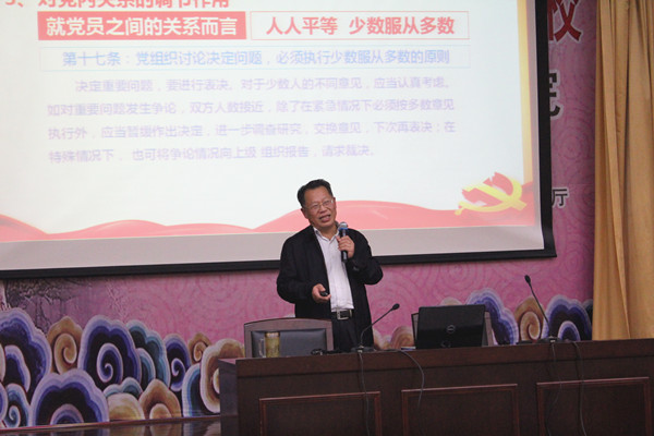 在提到党章的重要作用时,刘银国强调,党章是党的旗帜、是党的根本大法,明确了立党治党管党的总章程、总规距,党章发挥的作用主要体现在对党的领导和执政的规范作用、对党员的教育作用及对党内关系的调节作用。