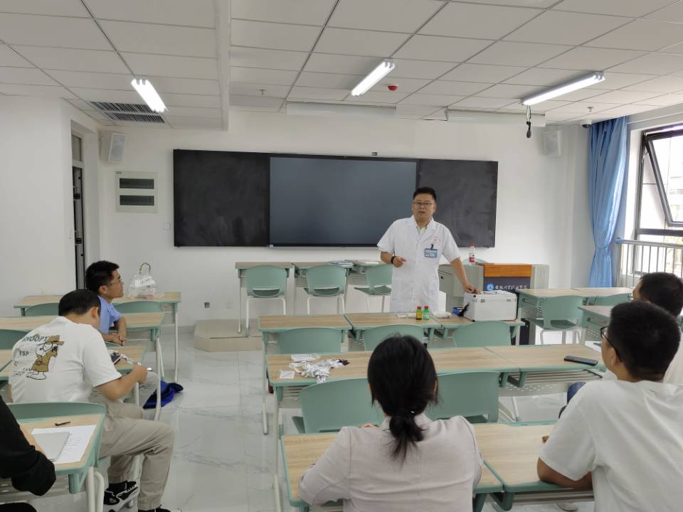 培训会上,魏立新从平时接诊中遇见到的在校大学生常见的校园意外伤害如常见的鼻出血、外伤伤口压迫、止血、消毒、包扎等急救技术及紧急情况下处置流程和方法。对伤口清创消毒步骤和处理过程中得注意事项,学生意外烫伤紧急处置“冲-脱-泡-盖-送”五部流程等进行详细的解说和演练。最后对院前急救的核心环节“心肺复苏”做重点讲解内容,对心跳骤停的判断、心肺复苏(CPR)的方法、步骤、操作注意事项以及复苏成功的临床指征等方面一一进行讲解演练。